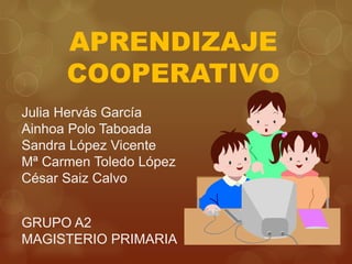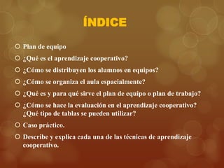Este documento describe el aprendizaje cooperativo y proporciona ejemplos de su aplicación en el aula. Explica que el aprendizaje cooperativo implica que los estudiantes trabajen juntos en equipos para adquirir conocimientos, y describe cómo distribuir a los estudiantes en equipos heterogéneos estables y equipos temporales de expertos. También incluye un caso práctico sobre los sentidos que utiliza varias técnicas de aprendizaje cooperativo como los equipos de expertos y el rompecabezas.