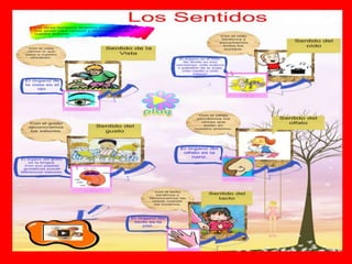 El documento explica los cinco sentidos del cuerpo humano (vista, tacto, oído, olfato y gusto) y propone una actividad práctica para que los niños identifiquen cuál sentido están utilizando al explorar diferentes objetos o estímulos como un peluche, chocolate, cebolla, joyero musical y observar el salón de clase.