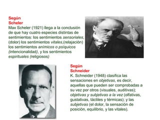 El documento discute los sentimientos desde diferentes perspectivas. Max Scheler identifica cuatro tipos de sentimientos: sensoriales, vitales, anímicos y espirituales. K. Schneider clasifica las sensaciones en objetivas, objetivas y subjetivas, y subjetivas. Los sentimientos son el resultado de las emociones y pueden ser buenos o malos, dependiendo de si hacen sentir bien o mal a la persona.