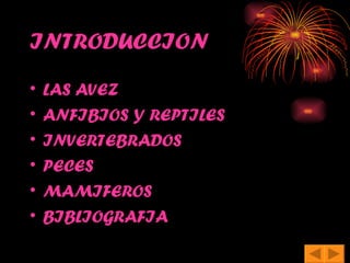 Este documento presenta información sobre diferentes grupos de seres vivos incluyendo aves, anfibios, reptiles, invertebrados, peces, y mamíferos. Para cada grupo, se proporciona un ejemplo breve con su definición tomada de Microsoft Encarta 2006. La bibliografía solo incluye a Microsoft Encarta 2006.