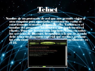 El documento describe varios servicios de Internet como Telnet, que permite controlar otra máquina remotamente; servicios de búsqueda de archivos como Gopher, Archie y Veronica; listas de correo que permiten comunicación entre grupos a través de correo electrónico; buscadores como Google y Yahoo que organizan información en Internet; chat que permite comunicación escrita en tiempo real entre personas; y correo electrónico para enviar y recibir mensajes electrónicos.