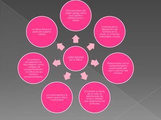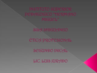 El documento trata sobre la ética profesional para docentes. Explica que la ética se refiere a los hábitos y actos humanos, y que comprende los valores, el carácter y la moral de una persona. También destaca que la ética estudia los deberes y derechos profesionales de cada profesión para formar personas con cualidades positivas.