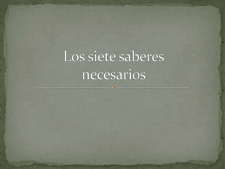 El documento argumenta que la educación debe comunicar conocimientos y desarrollar la inteligencia humana, teniendo en cuenta la naturaleza física, biológica, psicológica, cultural, social e histórica del ser humano. También sugiere que la educación debería enseñar sobre la historia planetaria, la complejidad de las crisis actuales, principios estratégicos para navegar la incertidumbre, y conducir a una mayor comprensión mutua y ética entre los humanos.