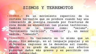 Este documento resume los conceptos de sismo y terremoto, explicando que son el mismo fenómeno pero el segundo término se usa para describir movimientos telúricos más intensos que causan daños. Luego describe algunos de los sismos más fuertes registrados en Chile, Ecuador y dentro de Ecuador, incluyendo detalles sobre víctimas, daños e historia.