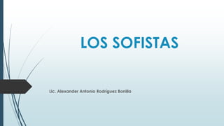Los sofistas eran pensadores griegos que enseñaban retórica y dialéctica a cambio de pago en Atenas durante los siglos V y IV a.C. Ofrecían enseñanzas útiles para la política democrática que surgía. Promovían un enfoque humanista y relativista, cuestionando las nociones de verdad y moral absoluta. Introdujeron nuevos métodos pedagógicos y fueron influyentes pero también controvertidos en la Atenas de la época.