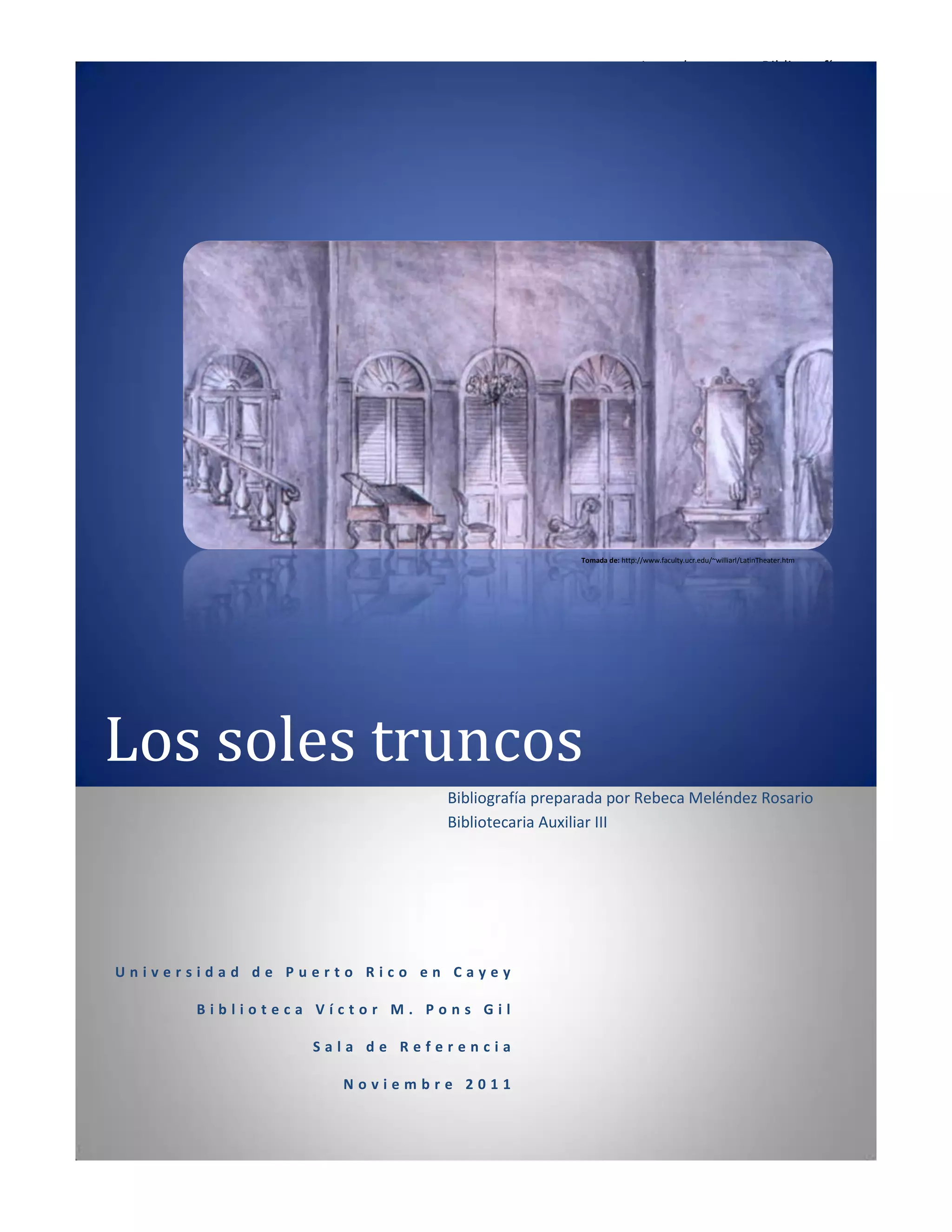Este documento presenta una bibliografía sobre la obra de teatro Los soles truncos escrita por el dramaturgo puertorriqueño René Marqués. Incluye resúmenes biográficos de Marqués y de la trama de Los soles truncos. Además, proporciona una lista de artículos y libros críticos sobre la obra encontrados en revistas, libros y bases de datos electrónicas de la biblioteca, escritos mayormente en español e inglés. El propósito es proveer recursos a estudiantes para que exploren investigaciones y