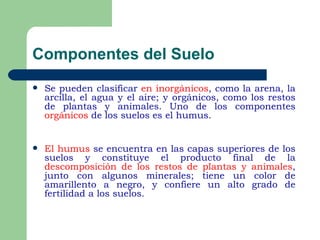 Los suelos se forman a partir de la descomposición de rocas por factores como la temperatura, el agua y los seres vivos. Están compuestos de materia inorgánica como arena y arcilla, y materia orgánica como restos de plantas y animales. Los suelos contienen distintos horizontes y propiedades que determinan su fertilidad y uso agrícola.