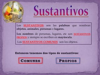 Este documento proporciona una introducción a los sustantivos en español. Explica que los sustantivos son palabras que nombran objetos, animales, personas o lugares. Indica que los sustantivos pueden ser propios o comunes, y que también varían en número (singular o plural) y género (masculino o femenino). Proporciona ejemplos de cada categoría y actividades para que los estudiantes practiquen la identificación de sustantivos.
