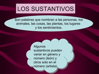 Este documento describe los diferentes tipos de sustantivos en español. Explica que los sustantivos son palabras que nombran personas, animales, cosas, plantas, lugares y sentimientos. Luego enumera y define las clases de sustantivos: sustantivos comunes, sustantivos propios, sustantivos individuales, sustantivos colectivos, sustantivos concretos, sustantivos abstractos, sustantivos contables y sustantivos no contables. Proporciona ejemplos de cada tipo de sustantivo.