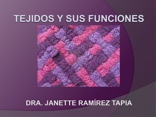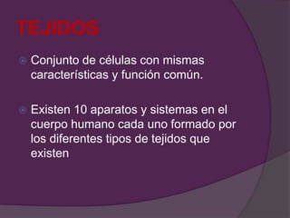 Este documento describe los diferentes tipos de tejidos que componen el cuerpo humano, incluyendo el epitelial, conectivo, muscular, nervioso, cartilaginoso, óseo, adiposo y hemático. Cada tejido está formado por células especializadas y tiene una función distinta como la protección, soporte, contracción, sensación y transporte en el organismo.
