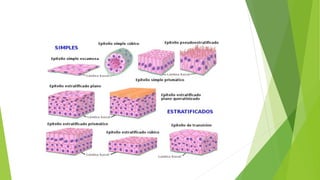 Este documento describe los cuatro tipos principales de tejidos animales: epitelial, conectivo, muscular y nervioso. Explica que el tejido epitelial reviste la superficie corporal y las cavidades internas, el tejido conectivo soporta y conecta otros tejidos, el tejido muscular genera movimiento, y el tejido nervioso detecta estímulos y transmite información a través de neuronas y glía. También clasifica los diferentes tipos de cada tejido y describe sus funciones.