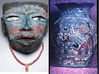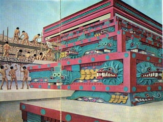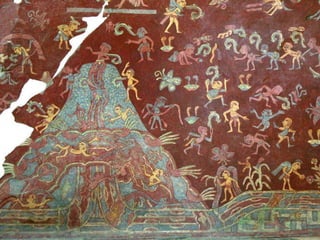 El documento describe la civilización Teotihuacana que se ubicaba en el centro de México. Incluye información sobre la localización de Teotihuacan, vistas satelitales que muestran sus grandes pirámides como la Pirámide del Sol y de la Luna, y reconstrucciones de varios templos y palacios encontrados en el sitio arqueológico como el Templo de Quetzalpapalotl y el Palacio de Tetitla. También menciona su conexión con otras culturas mesoamericanas como Kaminaljuyu