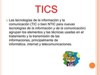 Este documento define las tecnologías de la información y la comunicación (TIC) como los elementos y técnicas usadas para procesar y transmitir información, principalmente computación, internet y telecomunicaciones. Cita a Kofi Annan diciendo que las TIC pueden mejorar la vida de todos y ayudar a lograr los Objetivos de Desarrollo del Milenio. Define las TIC como las tecnologías que permiten adquirir, producir, almacenar, procesar, comunicar, registrar y presentar información en forma de voz, imá