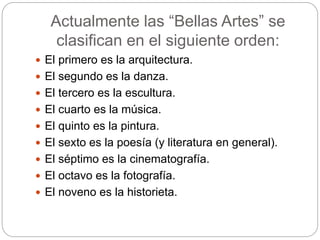 El documento clasifica las artes tradicionales, colocando la arquitectura en primer lugar, seguida de la danza, la escultura, la música, la pintura y la poesía. También menciona nuevas artes como la gastronomía, la perfumería, la televisión, el teatro, la moda, la publicidad, la animación y los videojuegos, pero no especifica cuál podría ser considerada el décimo arte.