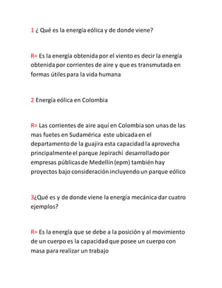 Este documento resume cuatro tipos principales de energía: energía eólica, que se obtiene del viento; energía mecánica, que se deriva del movimiento de objetos; energía hidráulica de Colombia, que se genera a través de represas que aprovechan la energía del agua; y ejemplos de energía mecánica como relojes, personas y vehículos en movimiento.