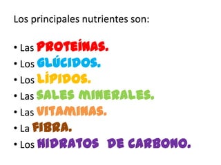 Este documento resume los principales tipos de nutrientes que componen una dieta saludable, incluyendo proteínas, carbohidratos, lípidos, sales minerales, vitaminas, fibra e hidratos de carbono. Cada nutriente proporciona un beneficio diferente como energía, materiales de construcción para el cuerpo, protección de órganos o el funcionamiento correcto del organismo. Los alimentos ricos en estos nutrientes incluyen carnes, pescados, huevos, lácteos, cereales, frutas, verduras y legumbres.