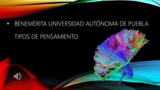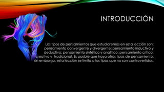 Este documento presenta y define varios tipos de pensamiento, incluyendo pensamiento convergente vs divergente, inductivo vs deductivo, sintético vs analítico, crítico, creativo y tradicional. Explica que el pensamiento convergente conduce a una solución conocida, mientras que el divergente permite múltiples soluciones. También describe el pensamiento inductivo como razonar de lo particular a lo general, y el deductivo de lo general a lo particular. Finalmente, distingue entre pensamiento sintético que reduce la información, analítico