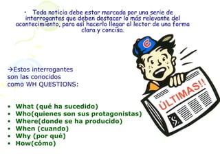 El documento describe los elementos clave de una noticia periodística. Explica que una noticia debe responder a las 6 preguntas clásicas (qué, quién, dónde, cuándo, por qué, cómo) y que la estructura típica incluye titulares (título, subtítulo), una entradilla que resume la información esencial, y un cuerpo con más detalles ordenados de más a menos importante.