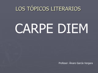 Este documento presenta una introducción a varios tópicos literarios como el carpe diem, ubi sunt, locus amoenus, la falsa modestia y la edad de oro. Incluye definiciones, ejemplos y citas literarias que ilustran cada uno de estos tópicos recurrentes en la literatura.