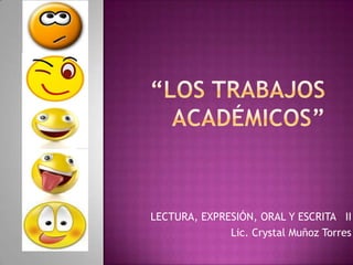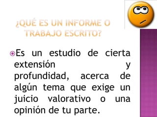 El documento describe los pasos para realizar un trabajo escrito académico efectivo. Explica que un trabajo escrito requiere ser claro, preciso, directo y razonado. Detalla las cuatro etapas clave: 1) elegir un tema, 2) delimitar el tema, 3) seleccionar información relevante, y 4) redactar el trabajo de manera descriptiva, expositiva o argumentativa. Además, un trabajo escrito debe incluir una presentación, índice, introducción, desarrollo, conclusión y bibliografía.