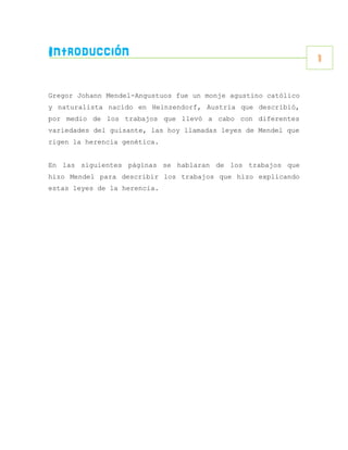 Gregor Mendel realizó experimentos de cruzamiento con guisantes para describir las leyes de la herencia genética. Sus experimentos establecieron tres leyes: la ley de dominancia, la ley de segregación de caracteres y la ley de distribución independiente de caracteres. Mendel cruzó guisantes con diferentes características como el color de la semilla y la textura de la semilla para probar estas leyes.