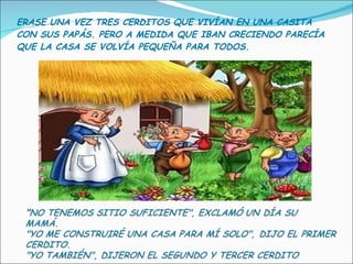 Había una vez tres cerditos que construyeron casas de diferentes materiales para protegerse de un lobo. El lobo derribó las casas de paja y madera, pero no pudo derribar la casa de ladrillo del tercer cerdito. Finalmente, al intentar entrar por la chimenea, cayó en una olla de sopa y fue capturado.