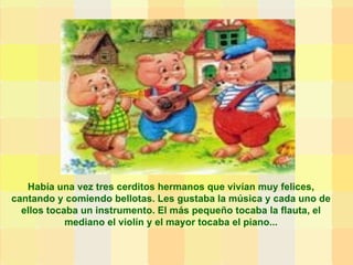 Los tres hermanos cerditos construyeron casas de diferentes materiales para protegerse del lobo feroz: paja, madera y ladrillos. El lobo derribó fácilmente las casas de paja y madera, pero no pudo con la de ladrillos a pesar de soplar fuerte. Intentó entonces bajar por la chimenea, pero cayó en un caldero de sopa hirviendo y huyó del lugar.