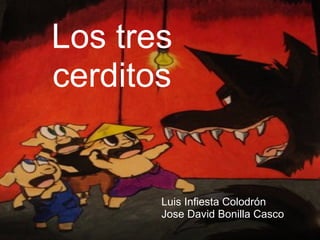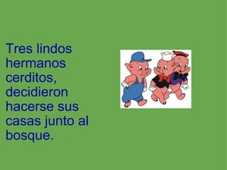 Los tres hermanos cerditos construyeron casas en el bosque, pero un lobo malvado sopló y derribó las casas de paja y madera del primer y segundo cerdito. El tercer cerdito había construido su casa de ladrillos, la cual el lobo no pudo derribar. El lobo trató de entrar por la chimenea pero los cerditos hirvieron agua y el lobo cayó en la caldera, recibiendo su merecido castigo.