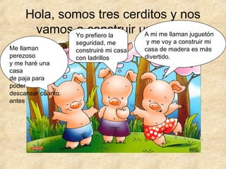 Los tres cerditos construyeron casas de diferentes materiales: perezoso hizo una de paja, juguetón de madera y el tercero de ladrillos. Cuando el lobo sopló, las casas de paja y madera fueron destruidas pero la de ladrillos resistió y el lobo se fue agotado, dejando a los cerditos felices y a salvo.