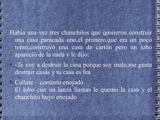Tres cerditos construyeron casas de diferentes materiales para escapar del lobo - el primero de cartón, el segundo de vidrio, y el tercer de metal. El lobo destruyó las casas de cartón y vidrio fácilmente, pero no pudo derribar la casa de metal. Los cerditos y un cazador finalmente atraparon y cocinaron al lobo.