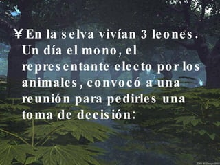 Los animales de la selva tenían que elegir a uno de los tres leones como su rey, pero no podían decidir cuál. Propusieron que los leones escalaran la montaña más alta y el primero en llegar a la cima sería el rey. Ninguno de los tres leones pudo llegar a la cima. Un águila escuchó que el tercer león dijo que aunque fue derrotado por ahora, él todavía estaba creciendo y podría lograrlo en el futuro. Por esta actitud de no rendirse, los animales eligieron al tercer le