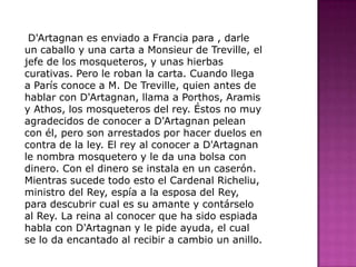 D'Artagnan es enviado a París para entregar una carta y un caballo, pero le roban la carta. Conoce a los tres mosqueteros Porthos, Aramis y Athos y pelea con ellos. El rey lo nombra como el cuarto mosquetero. Mientras tanto, el Cardenal Richelieu espía a la reina para descubrir su amante, el duque de Buckingham. Lady Winter, espía del Cardenal, roba un diamante para incriminar a la reina. D'Artagnan ayuda a la reina y
