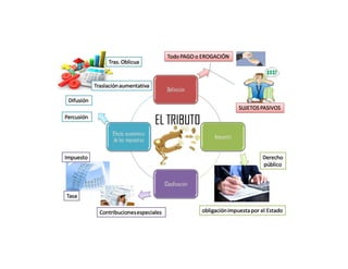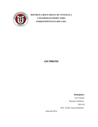 Este documento clasifica y describe los diferentes tipos de tributos en Venezuela. Identifica tres categorías principales: impuestos, tasas y contribuciones especiales. Los impuestos son obligaciones de dinero o bienes impuestas por el estado para cubrir gastos públicos. Las tasas representan un balance entre riesgo y ganancia por el uso de dinero. Las contribuciones especiales están vinculadas a beneficios individuales o de grupos derivados de obras públicas.