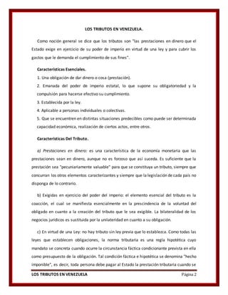 El documento habla sobre los tributos en Venezuela. Resume las características esenciales de los tributos como prestaciones en dinero exigidas por el Estado mediante ley para cubrir gastos públicos. Explica los tipos de tributos como impuestos, tasas y contribuciones especiales y los principios que rigen el sistema tributario venezolano como legalidad, capacidad contributiva y progresividad.