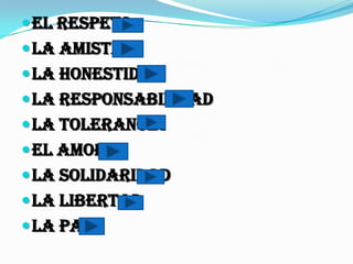 Este documento presenta definiciones breves de nueve valores fundamentales: el respeto, la amistad, la honestidad, la responsabilidad, la tolerancia, el amor, la solidaridad, la libertad y la paz. Cada valor se define en uno o dos párrafos describiendo su significado general y su importancia para las relaciones humanas.