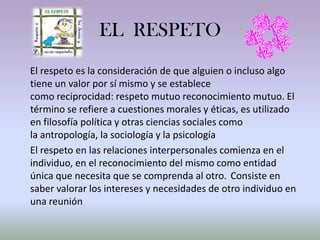 El documento presenta definiciones y descripciones de varios valores importantes como el respeto, la tolerancia, el amor, la humildad, la lealtad, la paz, la responsabilidad, la solidaridad y la compasión. Explica que estos valores son fundamentales para las relaciones interpersonales y la sociedad, y promueven la bondad, el entendimiento mutuo y el bienestar general.