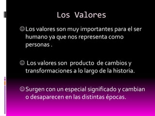 Este documento describe la importancia de los valores para los seres humanos, las comunidades y las familias. Explica que los valores morales surgen principalmente en la familia e incluyen el respeto, la tolerancia y la honestidad. También señala que los valores en la escuela y la familia enseñan a los niños a respetar a otras personas y a ser responsables.