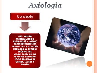 Este documento presenta información sobre el concepto de axiología y diferentes teorías sobre la existencia y naturaleza de los valores. Explica el subjetivismo axiológico, que sostiene que los valores son creaciones subjetivas, el objetivismo axiológico, que argumenta que los valores existen objetivamente, y el estructuralismo axiológico, que ve a los valores como emergiendo de la relación entre sujeto y objeto. También discute la jerarquía de valores y menciona algunos valores fundamentales como la dignidad humana,