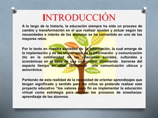 Este documento presenta un proyecto pedagógico para implementar el uso de las TIC con el fin de mejorar la enseñanza y práctica de los valores humanos en dos escuelas primarias. El proyecto busca involucrar a toda la comunidad educativa mediante el uso de herramientas digitales como PowerPoint, wikis y blogs para desarrollar contenidos sobre valores de manera lúdica y colaborativa. La metodología propuesta incluye talleres y aprendizaje basado en proyectos con evaluación continua. El objetivo es