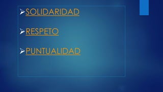 El documento describe tres valores importantes: la solidaridad, el respeto y la puntualidad. La solidaridad se refiere a apoyar causas de otros de manera desinteresada. El respeto implica considerar el valor inherente de las personas y cosas. La puntualidad es cumplir con tareas y obligaciones en el tiempo acordado. El documento también incluye enlaces a videos sobre estos temas.