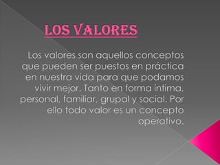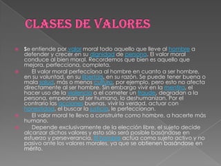 Los valores son conceptos que pueden mejorar nuestra vida de manera íntima, personal, familiar y social. Existen dos clases de valores: los valores morales, que conducen al bien moral y perfeccionan al ser humano al mejorar su voluntad, libertad y razón; y los valores no morales, que no afectan directamente la naturaleza humana. Los valores morales dependen de la elección libre del individuo y sólo se alcanzan mediante esfuerzo y perseverancia, donde el hombre es un sujeto activo.