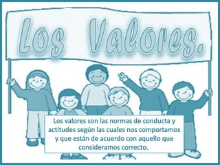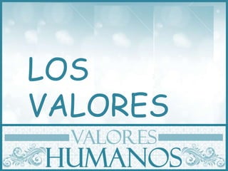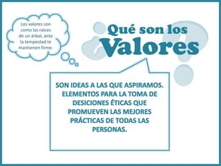 Este documento describe los valores desde diferentes perspectivas. Explica que los valores son como las raíces de un árbol que lo mantienen firme ante las tormentas. Luego define los valores como fuerza o fortaleza según su etimología en latín. Procede a enumerar los beneficios de los valores y sus características como independientes e inmutables. Finalmente, clasifica los valores en familiares, personales, espirituales, socio-culturales, materiales y morales, ejemplificando cada tipo.