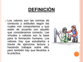 Este documento define y clasifica los valores morales. Explica que los valores son normas de conducta que guían el comportamiento correcto y surgen de la familia. Define los valores morales como aquellos que perfeccionan al ser humano haciéndolo más humano, como el respeto, la honestidad y la responsabilidad. También describe características de los valores como su independencia e inmutabilidad, y la importancia de los valores para motivar acciones y definir la identidad de una organización.