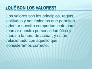Este documento describe los diferentes tipos de valores, incluyendo valores éticos y morales, socioculturales, personales, espirituales y materiales. Explica que los valores guían el comportamiento humano y varían según la edad, familia, cultura y otros factores. También destaca la importancia de inculcar valores en los niños para que puedan tomar mejores decisiones y ser personas más felices.