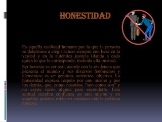 La honestidad implica actuar con base en la verdad y la justicia, dando a cada quien lo que le corresponde. Ser honesto es ser genuino y objetivo. La honestidad genera confianza en uno mismo y en los demás. La responsabilidad se refiere a cumplir con lo que se promete y usar los recursos de forma adecuada. El amor es comprender, servir y querer a los demás. El perdón es soltar la dureza hacia otra persona y sanar la relación. La lealtad es mantener los compromisos incluso ante circunstanc