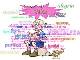 El documento clasifica y describe varios valores humanos. Incluye valores morales como la justicia y la honestidad, valores éticos como medios para lograr fines, y valores humanos inframorales como la riqueza, el éxito y el conocimiento. También describe valores como la responsabilidad, el respeto, la honestidad y la confianza, que permiten a los humanos relacionarse entre sí y consigo mismos de manera positiva.