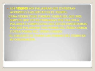 Este documento resume las características fundamentales de los verbos en español. Los verbos expresan acciones y las sitúan en el tiempo a través de sus diferentes formas verbales, que también indican número, persona y modo. Los verbos se conjugan según tres modelos (ar, er, ir) y sus formas verbales expresan acciones en pasado, presente y futuro.