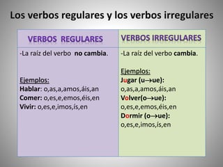 El documento describe diferentes tipos de verbos en español, incluyendo verbos regulares e irregulares, y verbos reflexivos. Explica que los verbos regulares no cambian su raíz durante la conjugación, mientras que los verbos irregulares sí cambian su raíz. También describe que los verbos reflexivos llevan el pronombre "se" y pueden ser regulares o irregulares. Proporciona ejemplos de conjugaciones de diferentes verbos para ilustrar estas categorías y conceptos verbales.