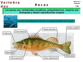 El documento describe las principales características de los cinco grupos de vertebrados: peces, anfibios, reptiles, aves y mamíferos. Explica que todos ellos tienen esqueleto interno con columna vertebral y que se diferencian principalmente por su hábitat, reproducción y forma de locomoción. También clasifica a los mamíferos según sus extremidades y forma de alimentación.
