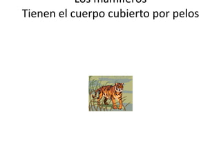 Los animales vertebrados se pueden clasificar en 5 grupos, uno de los cuales son los mamíferos que se caracterizan por tener el cuerpo cubierto de pelos y alimentarse de forma carnívora, herbívora u omnívora.